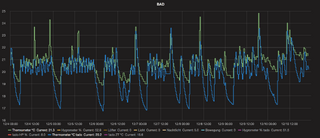 das funktionierte auch auf anhieb super, bis auf die tatsache, dass der sensor einen viel zu niedrige luftfeuchtigkeit meldete. nach ein paar testtagen, war klar, dass die luftfeuchtigkeit zuverlässig ungefähr 50% zu niedrig ist. also multipliziere ich die sensorwerte mit 2 und gut ist.