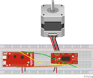 aber so, hängend, haben es die leute von senic auch gemacht. die schaltung habe ich auch mehr oder weniger von dort übernommen. neben einem esp8266 brauchte ich noch einen (hardware) schrittmotor-treiber, einen easy-driver. mit der schaltung von senic kann man einfach in einer schleife impulse an den treiber senden, jeder impuls ist dann eine bewegung nach vorne. bei meinen ersten tests zeigte sich, dass 500 schritte vorwärts (und zurück) ganz gut funktionierten. aber ich merkte auch, dass der schrittmotor-treiber sehr heiss wurde und der schrittmotor anfing leise zu singen. auf beiden systemen war ständig strom. in der dokumentation des schrittmotor-treibers stand allerdings, dass man den treiber auch abschalten könne. also habe ich die schaltung von scenig ein bisschen erweitert: