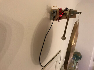 für die halterung habe ich, wie üblich, improvisiert. baumarktteile statt 3d-druck. aus einem kiefernholzregalbrett ein stück ausgeschnitten, darauf mit einer metallasche den motor festgeschraubklemmt, den klöppel direkt auf die achse geklemmt, fertig. den klöppel werde ich wohl noch mit heisskleber fixieren müssen, bisher funktioniert das aber stabil.