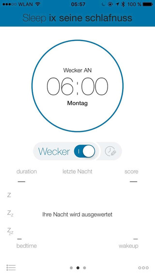 gestern abend bin ich dann, relativ gespannt, um halb zwölf ins bett gegangen. die standardeinstellungen fürs wochenende verzichten auf eine weckung, ich bin trotzdem um kurz vor sechs aufgewacht. auch wenn ich wusste, dass ich gegen zwölf uhr eingeschlafen bin und um kurz vor sechs aufgewacht bin, wollte ich gleich nachsehen was die app zu meinem schlaf meinte. die app bat mich um geduld, weil sie „meine nacht“ erst auswerten wolle.