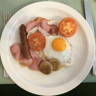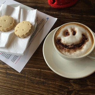 zweites schottisches frühstück mit spooky-smiley-cappuccino und „schrott-brett“ (wie die beifahrerin sagt).