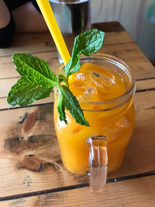 im salat ist eine dreiviertel gurke und eine halbe mango, jeweils in dünnen streifen, mit koriander und tomaten gemischt.