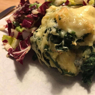 ofenkartoffeln mit spinat-gorgonzola-füllung ohne schale, aber mit käseresten. nach ottolenghis simple. die beifahrerin meinte, der salat dazu sei „fantastisch“ gewesen.