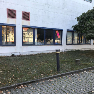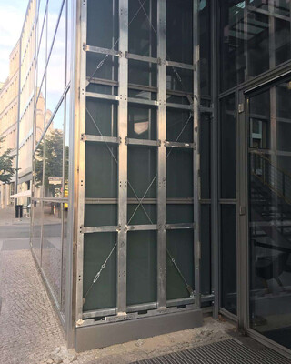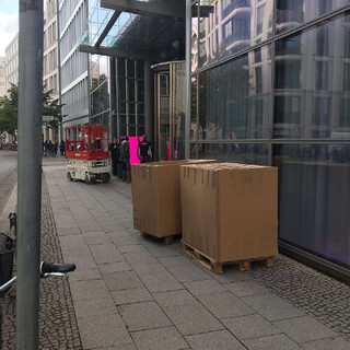 die telekom hat bemerkt, dass die großen, fehlerhaften displays vor dem haupteingang ihrer hauptstadtrepräsentanz doch nicht so repräsentativ sind und alles demontiert. #glitch