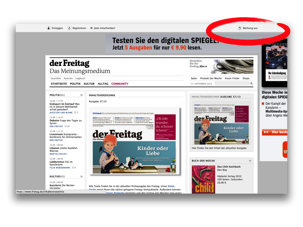 der freitag bietet seit der adblocker-aktion an, werbung auszublenden.