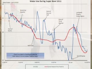 die ausschläge (lastspitzen) auf dem diagramm zeigen die aktivität des guten alten toiletten-fernsehwerbungs-blocker zur halbzeitpause des superbowls, zum dritten spielviertel und zum spielende.