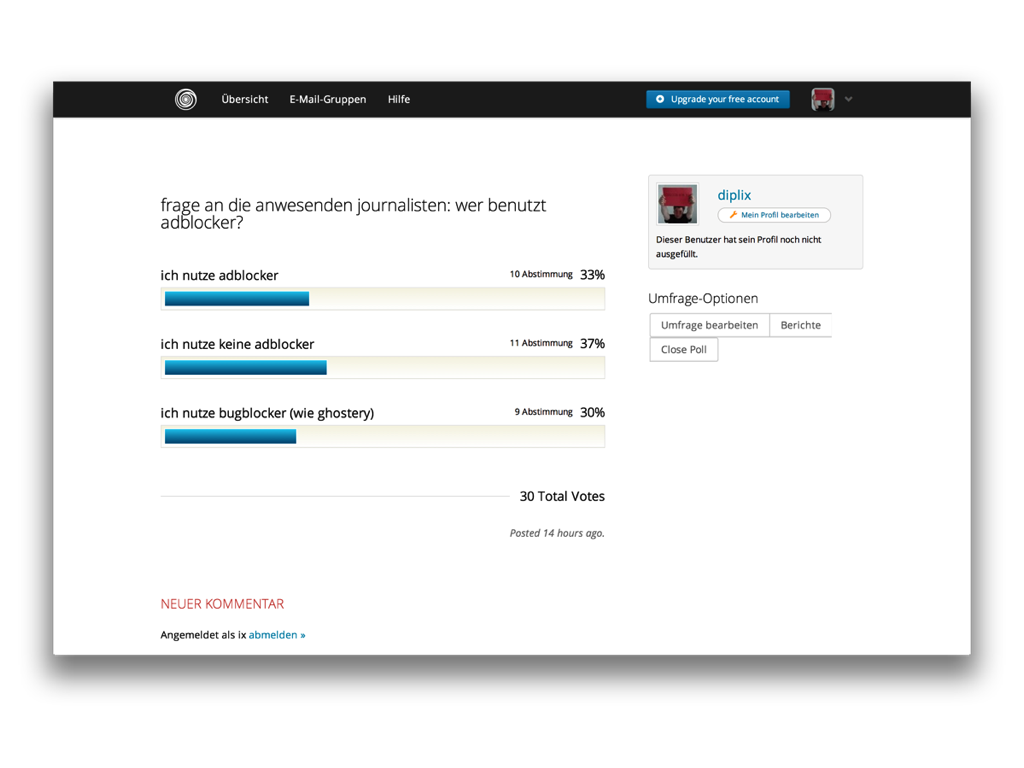 (diese mini-umfrage ist unrepräsentativ, aber zeigt klar das problem dem sie gegenüberstehen: adblocken und bugblocken funktioniert, also wird es angewendet.)