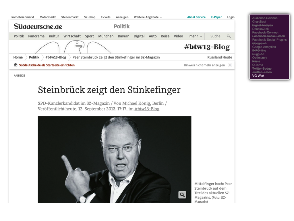der effekt ist, dass kaum noch werbung geladen wird, da die bei der SZ offenbar komplett von extern ausgeliefert wird.