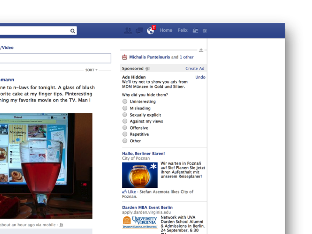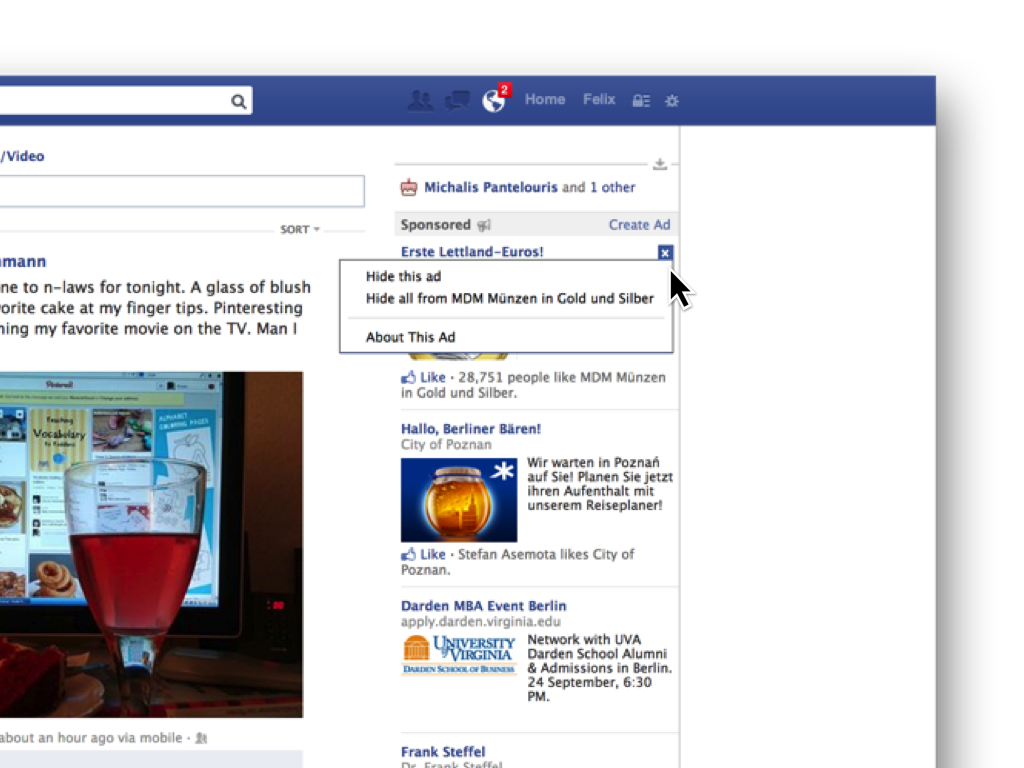facebook macht das sehr geschickt. wenn ich die anzeige für gold und münzen zum xten mal gesehen habe und nicht mehr sehen will, bietet facebook mir an, sie wegzuklicken und fragt mich dann, ob ich die anzeige, oder alle anzeige von der betreffenden firma wegklicken möchte …