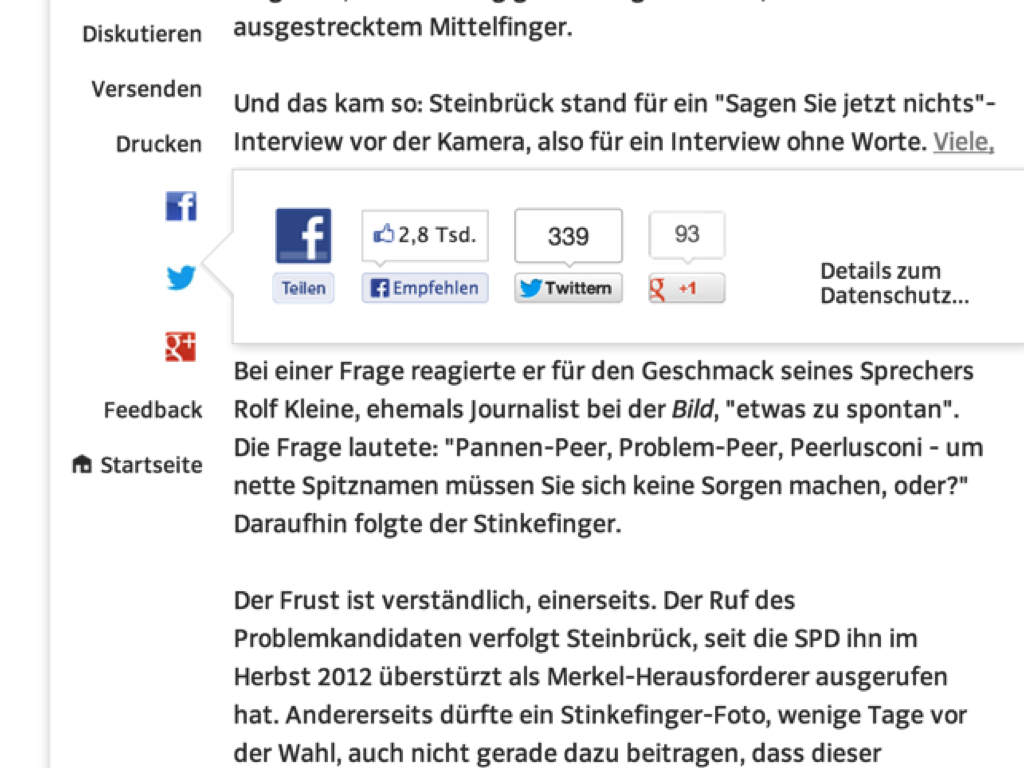 standardmässig lädt auf wirres.net nur die werbung, der ivw-zähler und die piwik-statistik (mittlerweile zwei piwik-statistiken, mokono zählt auch nochmal per piwik die besucher). social-buttons oder die kommentare werden beim ersten besuch nicht geladen, auch nicht deren scripte. erst beim aufklappen beispielsweise des twitter sliders wird code von twitter nachgeladen und eventuell vorhandene tweetbacks (lokal) nachgeladen. die sliderstellung wird ebenfalls per cookie gespeichert, bleibt also auch auf anderen seiten offen.