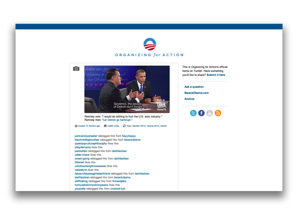 das ist eine seite aus barack obamas wahlkampf-tumblr. hier hat das wahlkampfteam im wahlkampf unmengen animierter gifs und bildmaterial hochgespielt.