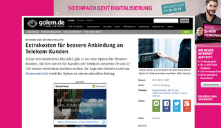 das ist schon ganz schön frech, was die telekom und potenziell andere grosse netzbetreiber hier machen. aber besonders ironisch ist die tatsache, dass ein artikel, in dem beschrieben wird wie man als seitenbetreiber der telekom schutzgeld bezahlen muss, um sicherzustellen, dass die eigene seite ordentlich ausgeliefert wird, mit einer werbung für telekom-eigenes hosting illustriert wird.