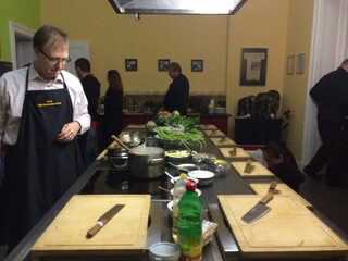 hier haben wir gestern unsere weihnachtsfeier gefeiert. „kochschule“ ist etwas übertrieben, wir haben zutaten zerschnipselt und meo bei der zubereitung zugesehen, ein bisschen fritiert und gerührt. aber das essen war sensationell lecker. alle zutaten waren bester qualität, alles, auch die curries und sossen, wurde frisch zubereitet und das ergebnis war beeindruckend und ausserdem äusserst fleischreich (von allen gängen wurden aber auch vegetarische varianten für unsere drei vegetarier zubereitet). die rezepte durften wir nach dem essen auch alle ausgedruckt mit nach hause nehmen.