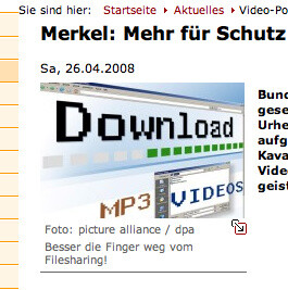 das ist doch immer wieder faszinierend, dass man selbst in der regierung meint die ansicht verbreiten zu müssen, filesharing sei per se illegal. empfehlen die schreibsklaven von frau merkel demnächst auch besser die finger weg zu lassen vom telefon? besser zuhause zu bleiben? was für eine unerträgliche arroganz, einfach mal eine technologie per regierungs-bildunterschrift als illegal zu brandmarken.
