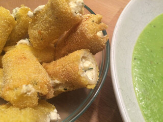 un­kom­pli­zier­te, pas­sier­te erb­sen­sup­pe mit croû­tons aus aus­ge­roll­tem toast­brot mit schafs­kä­se­fül­lung. aus nopi von #ot­to­lenghi.