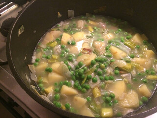 in der sup­pe ist ne­ben den erb­sen nichts wei­ter als zwie­beln, knob­lauch, po­ree und kar­tof­feln. al­les aus­ser den erb­sen wird lang­sam an­ge­düns­tet, ca. 10 bis 20 mi­nu­ten, dann noch­mal 10 bis 20 mi­nu­ten ge­kö­chelt und die erb­sen (und salz und pfef­fer) kom­men erst ganz zum schluss rein, da­mit bleibt die sup­pe dann schön grün.