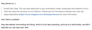 vor ein paar wo­chen hat in­sta­gram sei­ne API-re­geln ver­schärft und ver­langt jetzt eine ex­pli­zi­te frei­ga­be für API-nut­zung. heu­te hat in­sta­gram den an­trag auf in­sta­gram-API-nut­zung für bridgy ab­ge­leht. das ist ex­trem är­ger­lich und, wie ich oben in der über­schrift be­reits schrieb, gros­se silo-scheis­se.