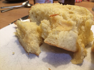 sorg­fäl­tig ver­kne­ten, das er­gibt ei­nen kleb­ri­gen teig, den man 2-3 mi­nu­ten in der ma­schi­ne kne­ten soll­te (ich habs per hand ge­macht) und dann lang­sam, nach und nach, 150 gramm but­ter un­ter­kne­ten. das wie­der­rum er­gibt ei­nen schön gnät­schi­gen teig. nach 45 mi­nu­ten hab ich den teig noch­mal leicht ge­kne­tet und in eine ge­fet­te­te form ge­füllt. da­drin liess ich ihm noch­mal 30 mi­nu­ten, aber er bock­te und ging nicht be­son­ders toll auf. die 15 mi­nu­ten im ofen bei 180° ha­ben nicht ganz ge­reicht um al­les durch zu ga­ren, aber wir ha­ben nach knapp 30 mi­nu­ten die aus­sen­stü­cke ab­ge­schnit­ten und die mit­te noch­mal 15 mi­nu­ten im ofen be­las­sen.