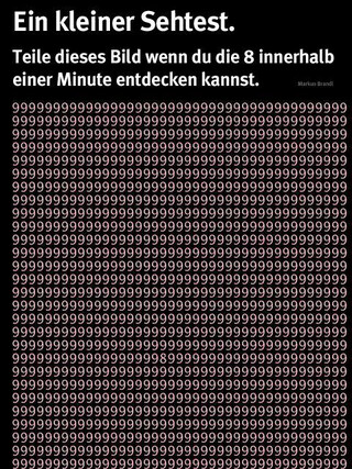 wenn man das suchbild so anguckt wie diese „magic eye“ 3d-bilder die mal vor 10 jahren modern waren (beispiel), die man sich mit etwas augenakrobatik ansehen muss um das inhärente bild zu sehen, jedenfalls wenn man das mit dem „parallelblick“ anguckt, sieht man die „8“ sofort als fliegenschiss/störung auf dem bild. funktioniert aber glaube ich auch mit augenzusammenkneifen, bildverkleinern oder mit gaußschem weichzeichnen.