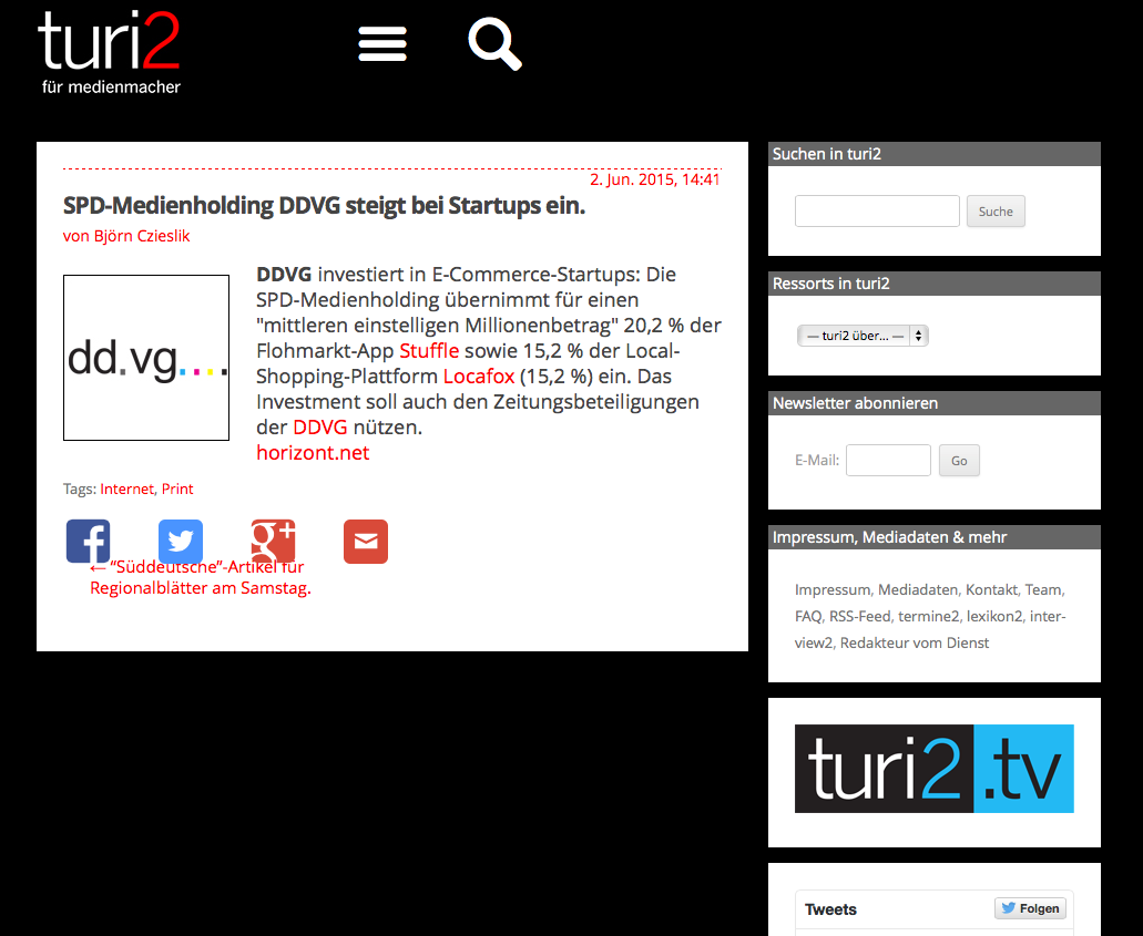 turi3 ist der News­stream der Bran­che. […] Op­ti­miert für Smart­phones kön­nen Me­di­en­ma­cher zu je­der Ta­ges- und Nacht­zeit bei uns se­hen, su­chen und kom­men­tie­ren, was welt­weit in der Me­di­en­bran­che ge­ra­de pas­siert und dis­ku­tiert wird.