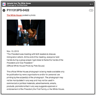 The Pre­si­dent was mee­ting with faith lea­ders to dis­cuss im­mi­gra­ti­on re­form. At the end of the mee­ting, ever­yo­ne held hands du­ring a group pray­er. I got clo­se to frame the hands of the Pre­si­dent and Vice Pre­si­dent.