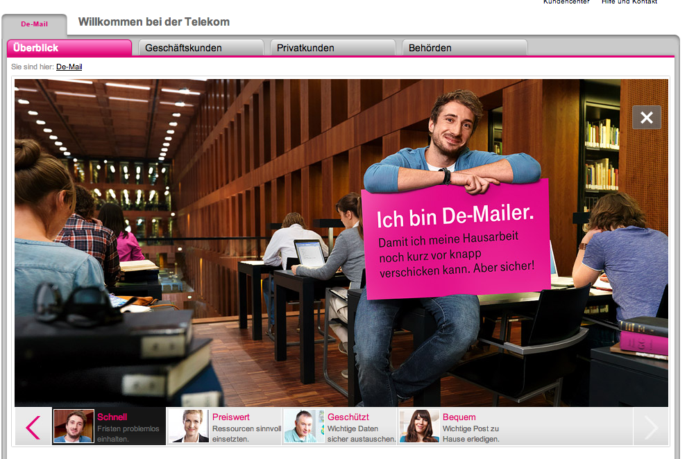 die frage ob die schauspieler in der werbung wirklich de-mailer sind, hat mir die telekom noch nicht beantwortet. auch meine frage, ob die tatsache dass der FC bayern münchen de-mail vielleicht deshalb benutzt, weil er werbepartner der telekom ist und nicht weil er einen bedarf oder nutzen davon hat. ich finde das enttäuschend bis unprofessionell. erst flutet man mich ungefragt mit informationen und wenn ich mal auf den werbemüll reagiere ist plötzlich niemand zuständig.