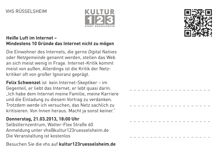 heute abend, um 18 uhr halte ich meinen warum-das-internet-scheisse-ist-vortrag in rüsselsheim, im selbstlernzentrum, in der walter-flex-straße 60. diesmal heisst der vortrag allerdings „heisse luft im internet“.