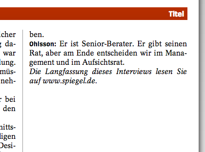 dann, auf sei­te — äh, kei­ne sei­ten­zah­len in der HTML5/epa­per-ver­si­on? — dann also ir­gend­wann bricht das der ti­tel­sto­ry fol­gen­de in­ter­view mit ikea-chef mi­ka­el ohls­son nach drei­ein­halb spal­ten text (oder 10 fra­gen) ab: „Die Lang­fas­sung die­ses In­ter­views le­sen Sie auf www.spie­gel.de.“