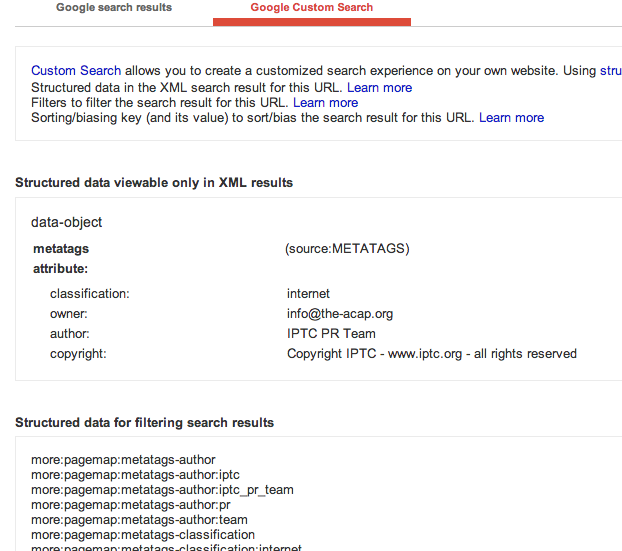 und zu­min­dest goog­le liest die struk­tu­rier­ten da­ten des acap-pro­to­kolls durch­aus ein, wie man in goo­gles rich snip­pet tool sieht (klick auf „Goog­le Cus­tom Search“):