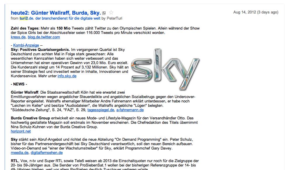 seine news-häppchen kommen bei mir im RSS-strom mit eingebetteter werbung an. so ein RSS-element beinhaltet alles wichtige: den autor, das veröffentlichungsdatum, einen link zur originalquelle, das gesamte HTML des artikels — lediglich das nutzlose drumherum wie die seitennavigation, der seitenleistentand und das widget-gedöns fehlt. theoretisch könnte der artikel auch noch mit einem ivw- oder vg-wort-pixel ausgestattet werden um die page-views artikel-ansichten zu erfassen und den scheiss zu vermarkten.