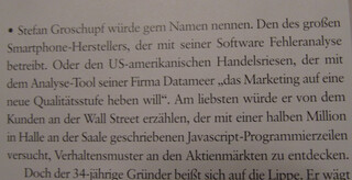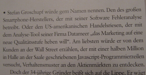 thomas ramge schreibt in der aktuellen brandeins-ausgabe über das hallenser unternehmen datameer. interessanter artikel über eine interessante firma, die mit der datengewinnung aus strukturierten und unstrukturierten daten geld verdienen will und die risikokapitalgeber von KPCB hinter sich stehen hat und so theoretisch zum nächsten google, amazon oder facebook werden könnte.