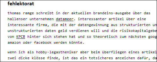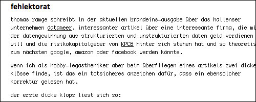wenn ich als hobby-legastheniker aber beim überfliegen eines artikels zwei dicke klösse finde, ist das ein totsicheres anzeichen dafür, dass ein ebensolcher korrektur gelesen hat.