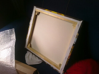 am aus­gang gabs als ab­schieds­ge­schenk die plat­te als „li­mi­tier­te de­lu­xe edi­ti­on“ (ecol­book mit au­dio-CD und DVD, sehr hübsch und hap­tisch an­spre­chend ge­macht) und das hie­ro­ny­mus-bo­schi­ge plat­ten­co­ver-bild auf ei­nen keil­rah­men auf­ge­zo­gen. über die plat­te (die es erst ab 14. mai zu kau­fen gibt), hab ich mich ge­freut, schliess­lich ge­fal­len mir tat­säch­lich ein paar der stü­cke, über den keil­rah­men hat sich die bei­fah­re­rin ge­freut: „oh! fan­tas­ti­scher keil­rah­men! das bild über­mal ich!“
