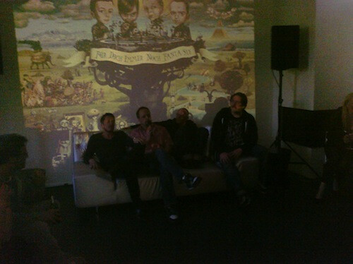 ge­gen vier­tel nach acht ka­men die vier dann, setz­ten sich auf ein sofa und smu­do fing so­fort an zu quas­seln. mi­chi beck film­te die an­we­sen­den und dad­del­te da­nach an sei­nem ipho­ne (weiss!). wenn mi­chi beck re­de­te, dad­del­te smu­do an sei­nem ipho­ne (schwarz!). tho­mas d. re­de­te auch hin und wie­der, pack­te sein ipho­ne aber nicht aus. an­dre­as rie­ke re­de­te gar nicht, be­nut­ze kei­ne gad­gets und be­schränk­te sich den gan­zen abend dar­auf an­we­send zu sein und sym­pa­thisch zu wir­ken.