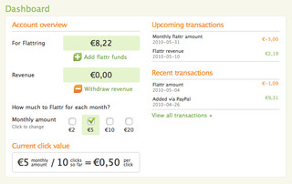 un­term strich ist das flattr-mi­cro­pay­ment-mo­del in der der­zei­ti­gen ge­schlos­se­nen beta-pah­se also in etwa fol­gen­des: man über­weist sich un­ter den flattr-mit­glie­dern geld hin und her und zahlt für die­ses spiel­chen ge­büh­ren. da­für kann man aber an­satz­wei­se so­was wie an­er­ken­nung der ei­ge­nen blog­bei­trä­ge (oder wie flattr das nennt „things“) mes­sen und in­ter­es­san­te blog­bei­trä­ge an­de­rer flattr-mit­glie­der fin­den, die von an­de­ren ge­flat­tert wur­den.