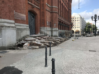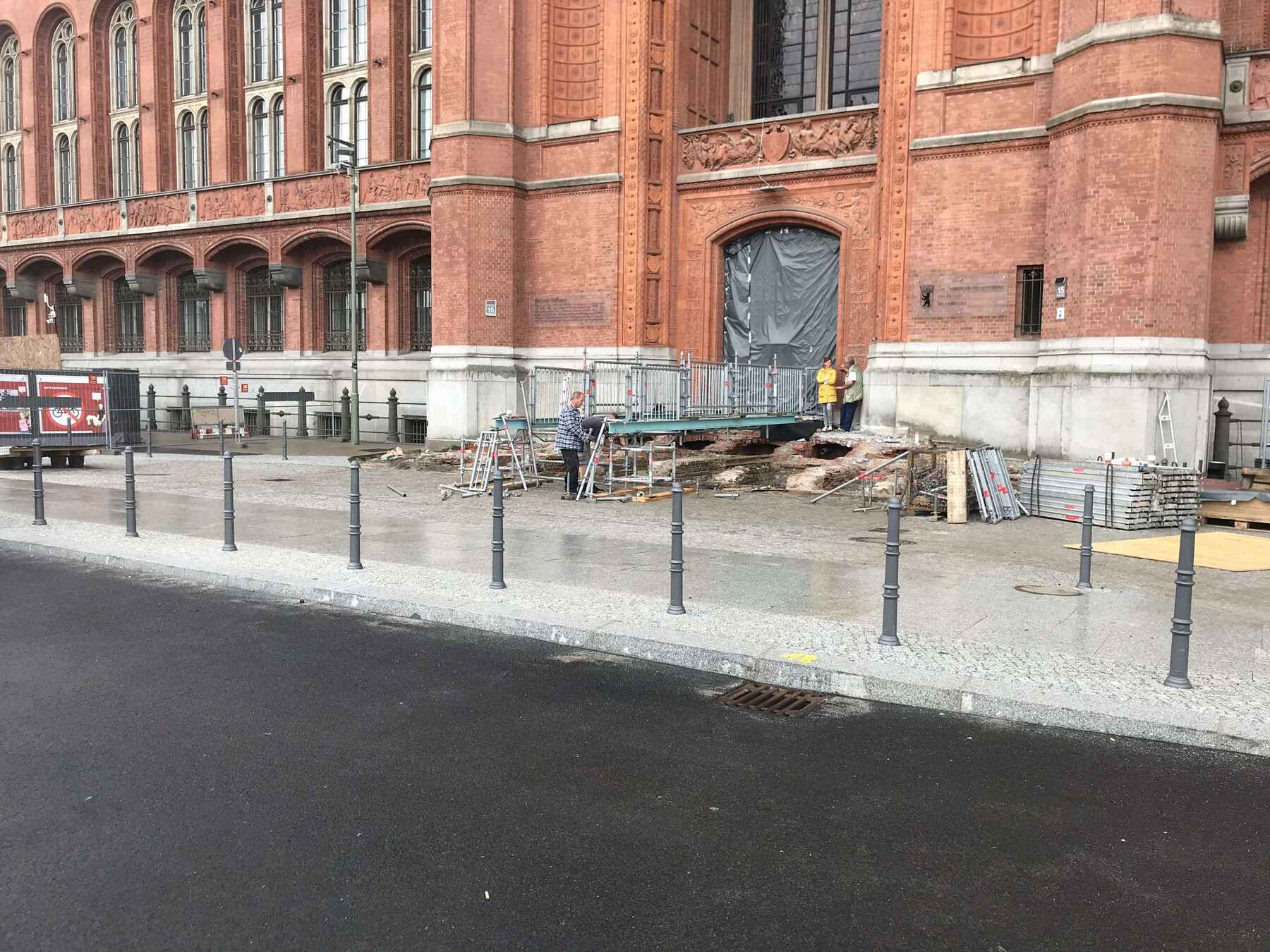 aus der rat­haus­trep­pe ist zu­erst ein schutt­hau­fen, dann ein loch und jetzt ein brü­cke ge­wor­den.