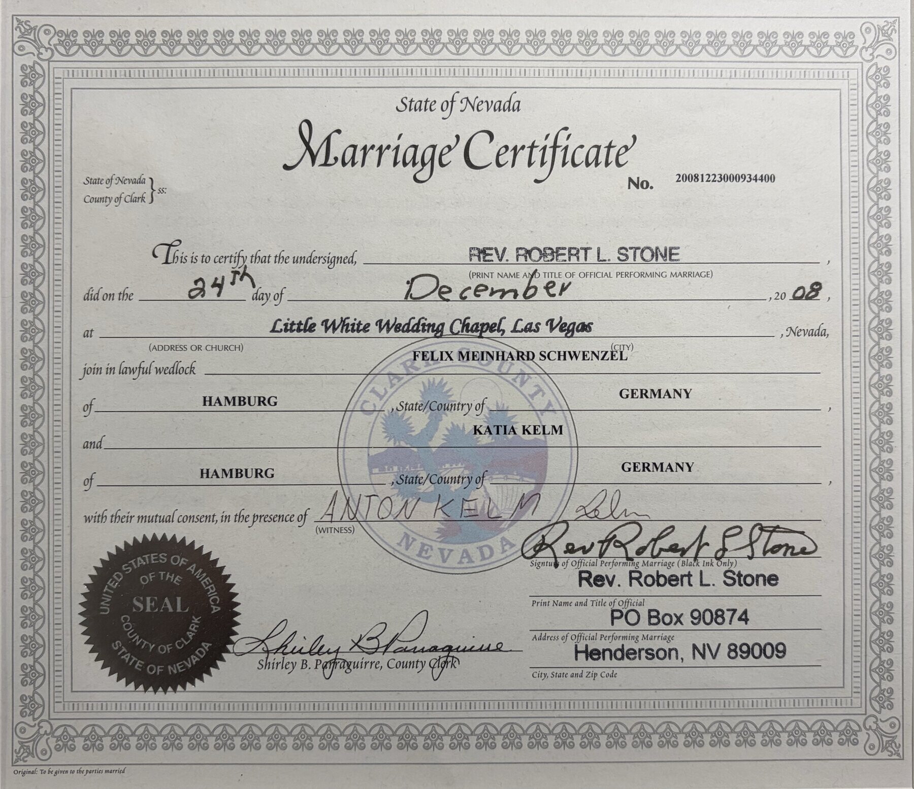 um die hochzeit danach in deutschland (rückwirkend) anerkennen zu lassen braucht man dann allerdings noch ein paar unterlagen, sehr viel geduld und die fähigkeit, deutsche beamte zu ertragen. einerseits verlangen die deutschen behörden für die rückwirkende anerkennung der hochzeit eine beglaubigte kopie, die man sich nachträglich mit einer 10 dollar geldanweisung recht einfach auf dem postweg aus las vegas schicken lassen kann. ausserdem wollen die deutschen behörden, dass man diese offiziell beglaubigte kopie nochmals beglaubigen lässt, mit einer sogenannten „apostille“. andere europäische länder schenken amerikanischen urkunden auch ohne apostille glauben, die deutschen, so sagte uns ein freundlicher mitarbeiter im einwohnermeldeamt in hamburg, tun das nicht, weil hochzeitsurkunden so oft gefälscht würden. (infoseite der stadt hamburg: „Sie haben im Ausland geheiratet? Wie Sie die Eheschließung beurkunden lassen können, erfahren Sie hier.“)