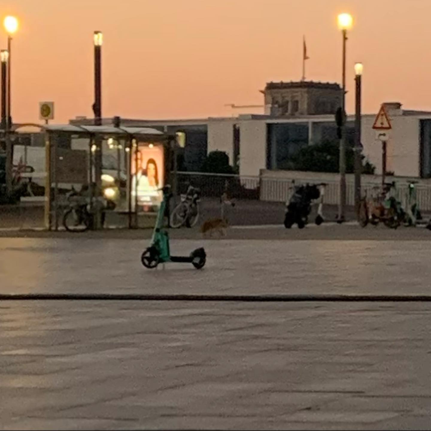 bild zu: bahnhofsvorplatz um sechs: ein fuchs auf der suche nach fressbarem, eine hundehaltern die ihren hund für ein …