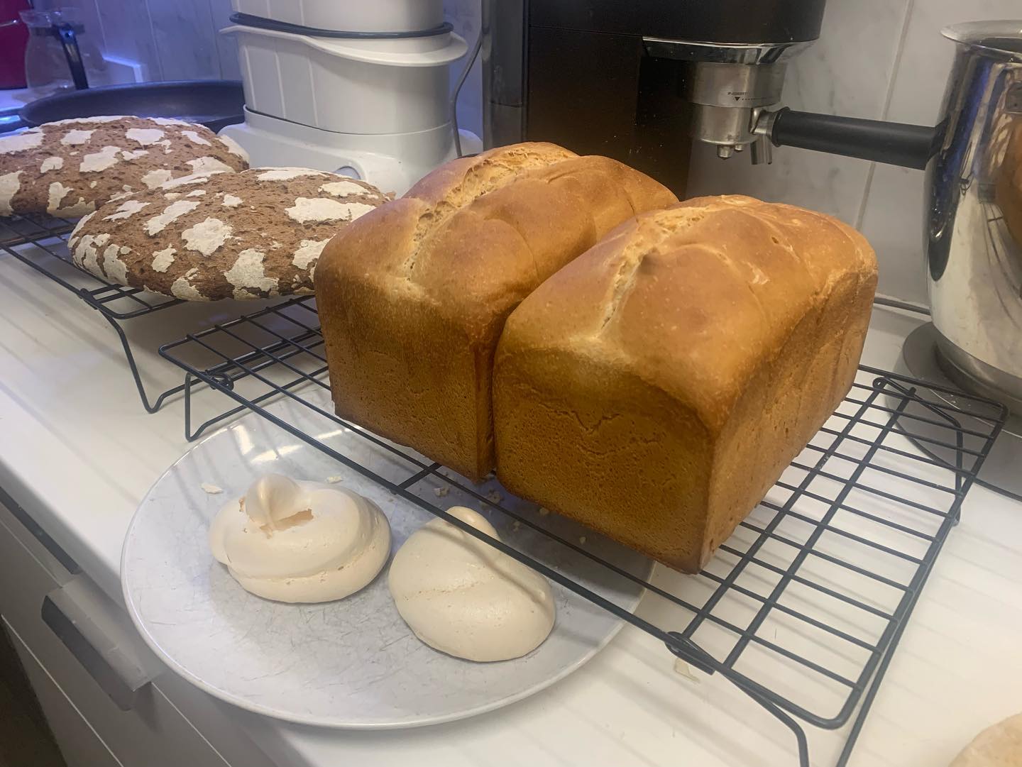 bild zu: produktiver tag heute, zwei fluffige, sehr feinporige toastbrote, zwei roggenvollkornbrote, aus den …