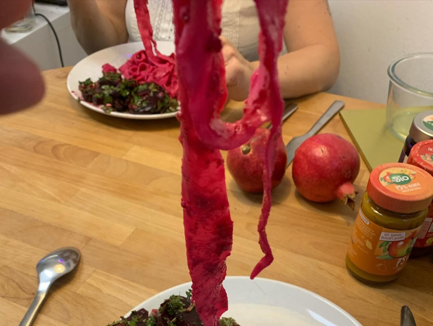 bild zu: gestern gab’s selbst gemachte nudel mit rote beete pesto und rote beete salat mit kräutern. rote beete …