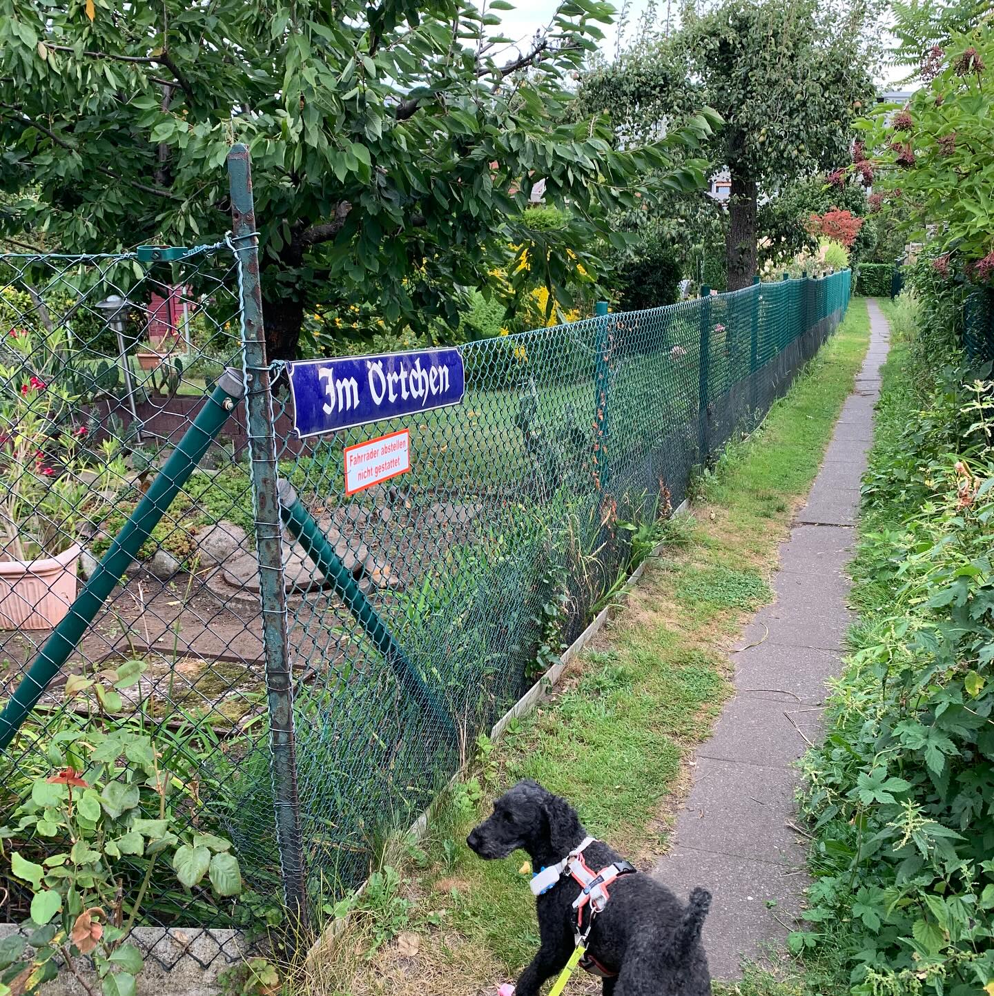 alt-text: foto eines strassenschildes in einer gartensiedlung auf dem steht „im örtchen“. dadrunter ein schild mit der aufschrift „fahrräder abstellen nicht gestattet“. auf diesem bild sieht man auch frida, unseren pudel.