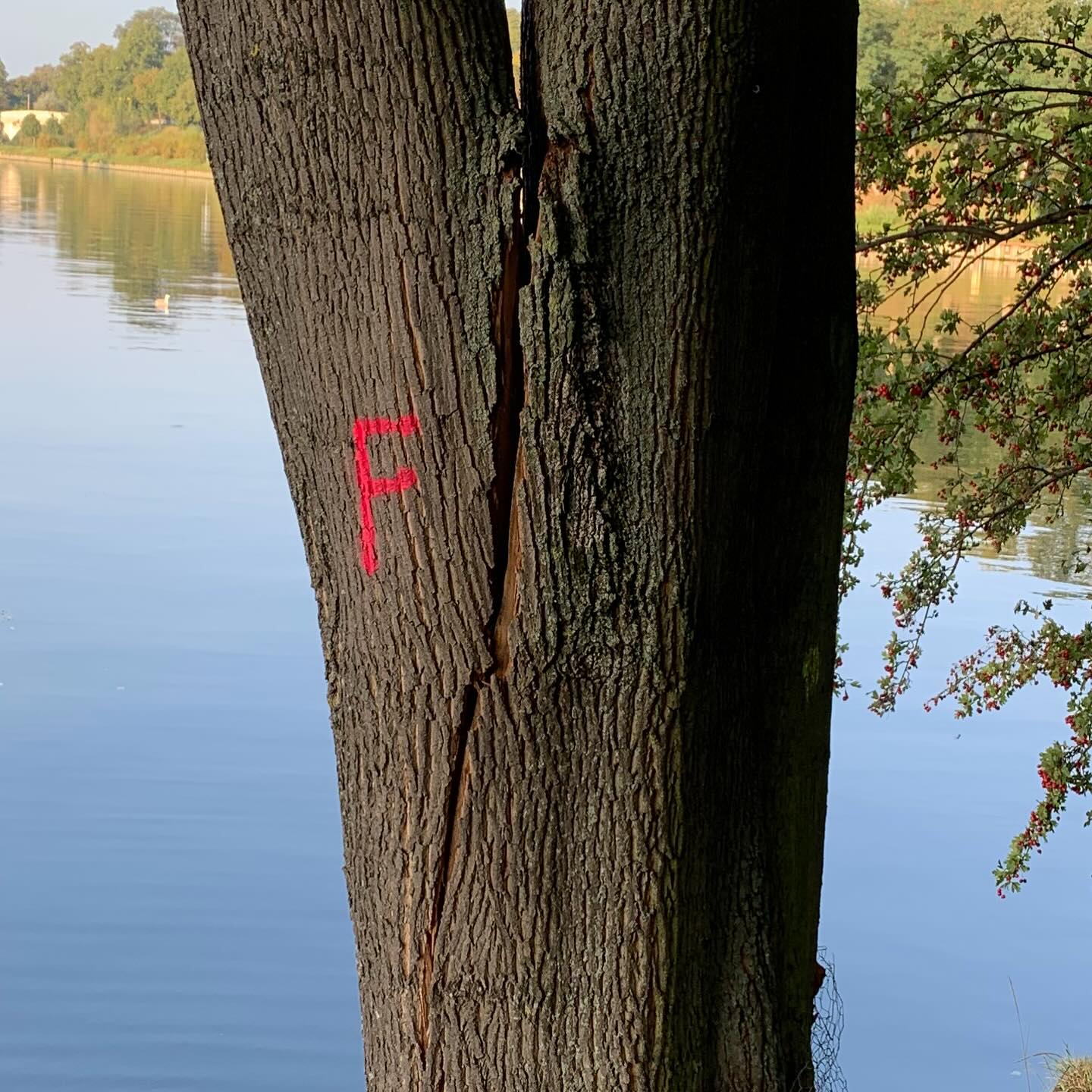 alt-text: bild eines lebenden baumstamms am kanal gegenüber dem behala-gelände der gespalten ist und mit einem F markiert ist.