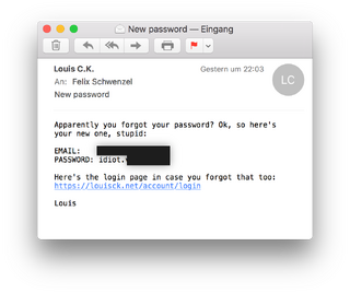wenn man auf louisck.net sein passwort vergessen hat, schickt die site ein neues passwort das mit „idiot“ anfängt.