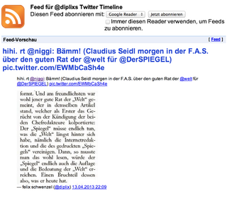 Endlich bin ich dazu gekommen, dem @diplix sein RSS zu personalisieren. übrig geblieben sind diese zwei Kanäle: pic.twitter.com/vVoNFOK9tj