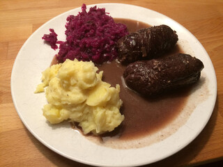 rin­der-rou­la­den (klas­sisch) mit kar­tof­fel­brei und tief­kühl­rot­kohl. per­fek­te ein­stim­mung aufs na­hen­de weih­nachts­fest.