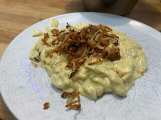 köstliche kalorienbombe. für schwäbische verhältnisse hatten die kässpätzle sicher etwas viel sosse, war aber egal, weil lecker. spätzle selbst schaben hat sich auch gelohnt, fest und fluffig zugleich.