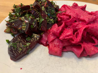 gestern gab’s selbst gemachte nudel mit rote beete pesto und rote beete salat mit kräutern. rote beete galore.