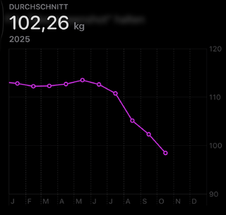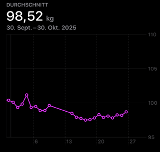 die halbwertszeit des semaglutids beträgt eine woche. das heißt um den 10. oktober herum verlor es offiziell seine wirkung. am 17. oktober standen glatte 97 kilo auf der waage, seitdem pendelt mein gewicht zwischen 97 und 99 kilo und das, wie die grafik zeigt, mit leichter tendenz nach oben. solche phasen mit steigenden tendenzen hatte ich auch mit semaglutid und meine erfahrung war: einfach weitermachen, ohne hastigen umstellungen, und dann zeigte die kurve auch bald wieder nach unten, zumindest im schnitt.