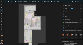 was ich tatsächlich seit jahren immer wieder nutze un eine übersicht über den zustand der wohnung oder der welt draussen zu bekommen, sind diese zwei dashboards. der interaktive ha-floorplan ist wartungsintensiv aber, offenbar, informativ. ich sehe den zustand der räume (besetzt/nicht besetzt), der lichter, bewegungsmelder, betten und grossgeräte (wasch-, spül- und duschmaschine) und kann lichter oder stati ändern.