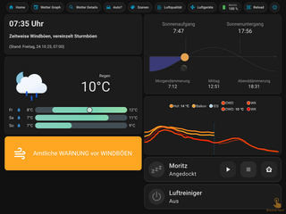 wir haben ein ipad im flur hängen das in erster linie wetter zeigt. man kann da zwar auch den luftreiniger im flur und den staubsauger steuern, aber der alltag zeigt: machen wir nicht. der luftreiniger schaltet sich selbst an und aus — je nach luftqualität und wenn die sensoren der beifahrerin empfindlicher sind, als die aus china, drückt sie den schalter auf dem luftreiniger selbst. und der staubsauger (moritz) fährt alleine los wenn ich beim morgenspaziergang bin und die beifahrerin noch im bett liegt — oder niemand mehr zuhause ist.